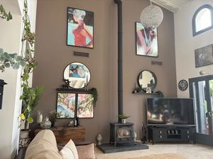 - La entrada se abre a un enorme salón-comedor, con chimenea y techos altos con vigas de madera. Un porche cubierto original se ha integrado perfectamente en el espacio vital, haciendo que el salón sea increíblemente espacioso y esté lleno de luz natural.