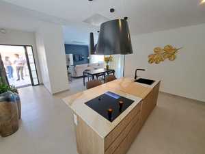 Las casas han sido construidas pensando en la naturaleza. Las paredes parciales de piedra natural le dan un carácter distintivo y cálido y ayudan a que se mezclen con la zona montañosa que hay detrás.
