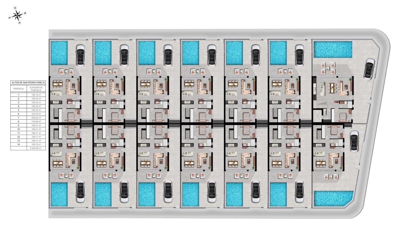 Modernas villas de nueva construcción con piscina privada en San Pedro del Pinatar Diseño contemporáneo y calidad de vida superior Descubra la tercera fase de este exclusivo proyecto residencial en San Pedro del Pinatar, donde la arquitectura moderna se une al confort y la funcionalidad. Estas 14 villas adosadas están diseñadas con un estilo minimalista y acabados de alta calidad, ofreciendo una experiencia de vida elegante y sofisticada en la Costa Cálida. Cada villa cuenta con 3-4 amplios dormitorios, 3 baños, piscina privada, terrazas y jardín privado, creando el entorno perfecto para la privacidad, la relajación y la vida al aire libre mediterránea. San Pedro del Pinatar es una de las localidades más cotizadas de la zona del Mar Menor, conocida por sus salinas naturales, sus tranquilas playas y su agradable clima durante todo el año, lo que la hace ideal tanto para vivir como para pasar las vacaciones. Distribución diáfana diseñada para la vida moderna Las villas están cuidadosamente distribuidas con una cocina abierta conectada a una luminosa sala de estar y comedor. Las grandes ventanas de la sala de estar, con persianas motorizadas, proporcionan acceso directo a la zona de la piscina y permiten que la luz natural inunde los espacios interiores. Las características principales de cada propiedad incluyen: 3 dormitorios con armarios empotrados 3 baños completamente equipados con tocadores, espejos y mamparas de ducha Cocina amueblada con electrodomésticos Balay incluidos Piscina privada y zona de jardín Iluminación LED interior y exterior Terrazas en la primera planta y solárium opcional en la azotea Plaza de aparcamiento en la parcela Sistema aerotérmico para agua caliente Paneles solares fotovoltaicos para una mayor eficiencia energética Preinstalación de aire acondicionado por conductos Estas viviendas están diseñadas para combinar sostenibilidad, comodidad y estilo moderno en cada detalle. Ubicación privilegiada cerca de playas y servicios Situada entre el Mar Menor y el mar Mediterráneo, San Pedro del Pinatar es un paraíso para los amantes de la playa y los deportes acuáticos. La localidad ofrece un animado puerto deportivo, baños de barro naturales, tiendas, restaurantes, instalaciones deportivas y excelentes servicios durante todo el año. Playas del Mar Menor a 3 km Playas del Mediterráneo a 5 km Centro comercial Dos Mares a 5 km Lo Romero Golf a 10 km Roda Golf a 15 km Aeropuerto de Murcia Corvera a 30 km Aeropuerto de Alicante a 80 km Puerto deportivo de San Pedro a 4 km Una vivienda ideal para vivir y como inversión Gracias a su ubicación, diseño y características de eficiencia energética, estas villas representan una excelente oportunidad como residencia permanente, vivienda vacacional o inversión para alquilar en una de las zonas más atractivas de la Costa Cálida. Póngase en contacto con nosotros hoy mismo para obtener más información o concertar una visita y asegurarse su nueva villa en San Pedro del Pinatar.
